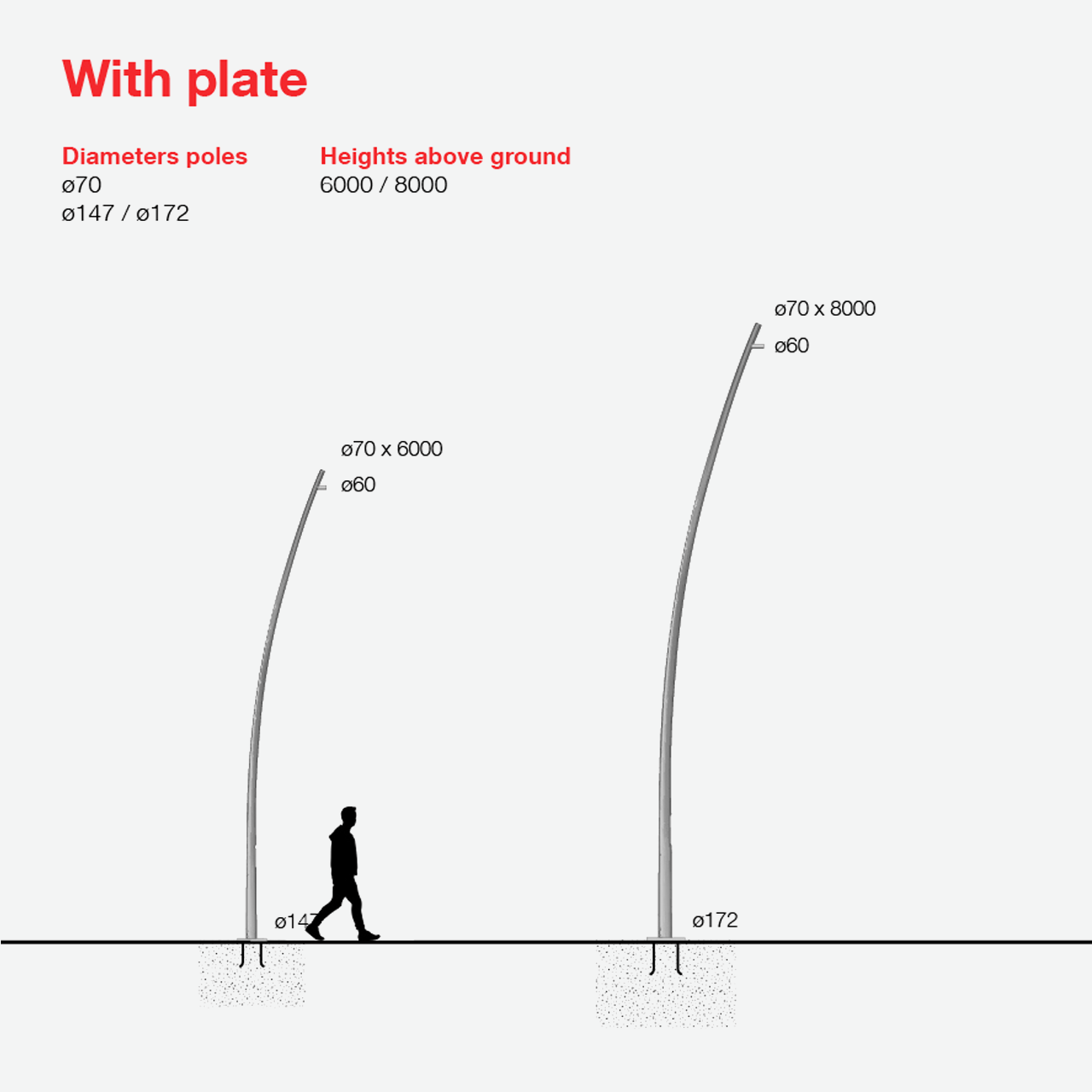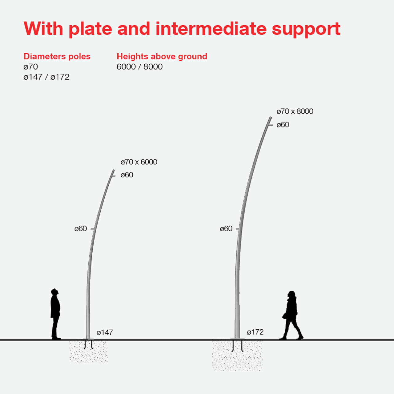 - The poles are fitted with a Ø60mm diameter single or double lateral cylindrical attachment.